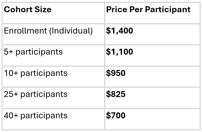 - Format: Three interactive, 90-minute sessions delivered live (in-person or online).
